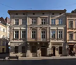 Кам'яниця наріжна, цегляна, триповерхова, майже прямокутна у плані, трисекційна (головний будинок, подвір'я, флігель). Первісна будівля була зведена у стилі бароко, наступні перебудови надали їй рис рококо і класицизму. Фасад тинькований, на рівні першого поверху викладений тесаним каменем. Чільний фасад, що виходить на вулицю Краківську, розкріпований, має шість вікон. Його центр підкреслений ризалітом на два вікна та балконом по ширині ризаліту. Пілястри на ризаліті та наріжнику прикрашені рокайлями та вертикальними ліпними гірляндами. Балкон спирається на п'ять декорованих різьбою кам'яних консолей, центральну з яких підтримує фігурка сатира.