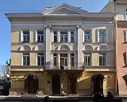 Будинок цегляний, прямокутний у плані, триповерховий, тинькований. Фасад широкий, симетричний, у центральній частині підкреслений балконом і ризалітом із іонічними пілястрами. Карниз – профільований, із трикутним фронтоном по центру. На першому поверсі фасадної стіни розміщені чотири портали з арковими завершеннями, вікна оформлені профільованими обрамленнями, на другому поверсі увінчані додатково напівкруглими сандриками.