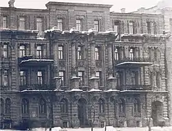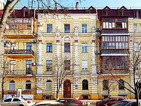 Фасад прикрашено ліпниною, картушем з ініціалами власника будинку, балкони — кованими металевими ґратами.