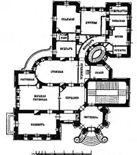 | ...обшивка стін — вільха, 4 живописні плафони роботи Eugenio Sala, парадні мармурові сходи (з білого карарського мармуру в чорну жилку)... всі роботи з окуття дверей та вікон і всі декоративно-металеві вироби — бельгійське товариство металевих виробів, паркети — Здолбунівська паркетна фабрика «Тайкург», керамічна плитка для підлоги, ванн і клозетів — завод Бергенгейма в Харкові, облицювання стін у ванних — фаянсовими плитками Веллера, бронза та електричне освітлення — фабрика бронзи Сековського у Варшаві за спеціальними малюнками... |