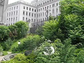 Доволі скромна за розмірами земельна ділянка використовувалася проте раціонально. На подвір'я в'їжджали повз подвійні арки пандусом, з'єднані з цегляною підпірною стіною. Ліворуч від центрального фасаду тішив око камерний садок з альпійською гіркою та фонтаном.