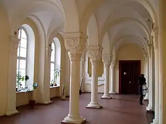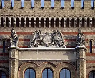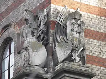 На головному та тильному фасадах розміщено 26 скульптурних елементів та 8 барельєфів авторства Ґодебського та Пер'є[1]. На головному фасаді, з обох боків від гербу Австрійської імперії, розміщено майже двометрові фігури чоловіка (Воїн) та жінки (Спокій), палітра та кисть біля їхнього підніжжя символізують Науку та Мистецтво. Над протилежними брамами – і ззовні, і зсередини двору, розміщено чотири барельєфи, що символізують Воїна і Перемогу. Скульптурне оздоблення інтер'єру до наших днів не збереглося. Втрачено багато елементів скульптурного декору, головно із внутрішнього боку, статуї чотирьох славетних австрійських фельдмаршалів та генералів: архікнязя Карла, графа Радецького, князя Шварценберґа і графа Шліка. Не збереглася також зала з фресками.
