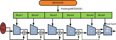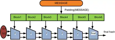 На діаграмі, однобічна функція стискання позначена як f, і перетворює вхід певної довжини на вихід тої ж довжини. Алгоритм стартує з ініціалізаційним вектором, ініціалізаційний вектор (IV). IV це фіксоване значення (специфічне алгоритму або реалізації). Для кожного блоку повідомлення, функція стискання f бере поточний результат і поєднує його з наступним блоком повідомлення, утворюючи проміжний результат. Останній блок доповнюється нулями і бітами, що представляють загальну довжину доданого повідомлення. (Нижче наведений приклад довжинного додавання в подробицях.)
