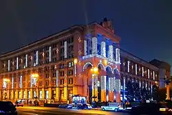 Цегляна будівля має сім поверхів і напівповерх, пласкі залізобетонні перекриття, бляшаний вальмовий дах. У плані Г-подібна з двома крилами завдовжки близько 80 метрів. Крило з боку Хрещатика ледь дугоподібне.