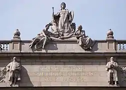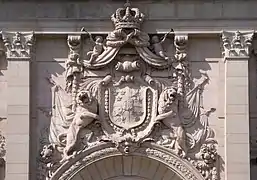 Гранітний рельєф із великим національним гербом Швеції, оточеним левами, скульптор Густав Фредрік Норлінг.
