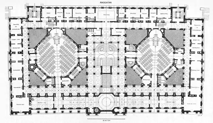 Архітектором, який проектував будинок парламенту, був Арон Йогансон. Він не виграв в архітектурному конкурсі 1889 року. Переможцем став Вальфрід Карлсон, але жодна з конкурсних пропозицій не вважалася достатньо гарною, і Карлсон був відсторонений. Натомість Гельго Цеттерваллу було доручено розробити нову пропозицію, а його помічником він обрав молодого Арона Йогансона. Разом вони представили спільний проект у 1890 році. Однак, він був розкритикований багатьма провідними художниками та архітекторами того часу. Вважалося, що таку велику монументальну споруду не можна розмістити так близько до палацу і що Гельгеандсгольмен був занадто переповнений, щоб розмістити ще й будинок парламенту та Національного банку. Коли будівельний комітет у 1892 році вирішив перенести фасад ще на шість метрів у напрямку до Норрбро, Зеттерваль подав у відставку, вважаючи це неприйнятним. Молодий Йоганссон працював далі над проектом самостійно.[2] У проекті 1894 року в будівлі був купол, який ніколи не зводили.