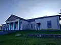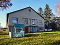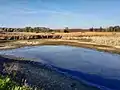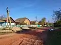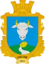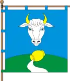 Квадратне полотнище розділене горизонтально опукло у співвідношенні 3:1 на синю і зелену частини. На верхній частині біла голова буйвола із жовтими рогами. На зеленій частині з перевернутого жовтого глечика витікає білий струмок.