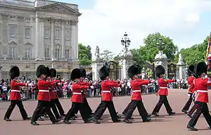 - Напевно, найвідоміша традиція, яка стала своєрідною візитівкою Лондона і приваблює сотні туристів щодня, пов'язана з охороною палацу — придворним дивізіоном, що складається з полку гвардійської піхоти та Королівського кінногвардійського полку — щодня об 11:30 від квітня до серпня відбувається зміна караулу (в решту днів року церемонія відбувається через день), яка являє яскраве дійство з чітко виписаним сценарієм.