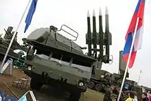 ![]() Самохідна установка 9А317Е ЗРК «Бук-М2Е» на авіасалоні МАКС — 2009. | |