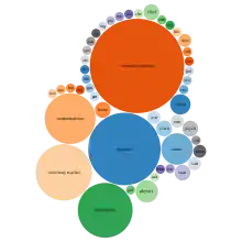 - У візуалізації інформації «бульбашкова діаграма» може означати техніку, в якій набір числових величин подано щільно упакованими колами, площі яких пропорційні величинам. На відміну від традиційної бульбашкової діаграми, в такий варіант не використовують положення за осями x або y, а прагнуть упакувати кола якомога щільніше, щоб ефективно використати простір. Ці бульбашкові діаграми, після введення Фернандою Вієгас та Мартін Ваттенберг[4], стали популярним методом відображення даних. Кругові упаковані діаграми включені до популярних наборів засобів візуалізації, таких як D3[5], і використовуються, наприклад, в New York Times.[6]
