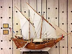 Усі щогли на бумі в якості головного вітрильного озброєння несли характерні косі «арабські» вітрила (англ. settee sail) у формі неправильної трапеції з короткою передньою шкаториною[6]. Головне вітрило піднімалось на передній великій грот-щоглі, тоді як кормові щогли (бізань і мала бізань) несли такі ж по формі вітрила, але значно меншого розміру ніж головне і, крім свого основного призначення, могли при маневрах виконувати роль повітряного керма. На великих бумах з високою грот-щоглою, на ній, над косим арабським гротом, іноді встановлювався чотирикутний топсель.
