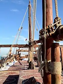Для цього Тім Северін за допомогою команди корабельників з Суру в Омані відтворив репліку старовинного арабського судна типу бум з IX століття. Команда збудувала без жодного металевого цвяха за сім місяців судно довжиною 26,5 метрів, використовуючи вручну виготовлені дошки, зшиті за допомогою 640 км мотузок, також виготовлених вручну з койру — лушпиння кокосового горіха, вимоченого в морській воді[8].