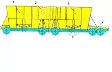 Секційний бункерний поїзд з донним розвантаженням також не має міжвагонеючного просюру, то значно зменшує довжину состава і витрати металу на його виготовлення. Поїзд під час завантаження знаходиться безпосередньо під конвейєром (бункер) і в міру заповнення секцій переміщується. У конструктивному розумінні такий поїзд являє собою постійно нерозчепленип состав із окремих шарнірно-поєднаннх секцій з відкидними днищами. Кожна така секція (металевий зварний кузов з одним скатом) своєю консольною частиною опирається на наступну. Передня (І) і задня (3) секції (рис. 3) на відміну від проміжних (2) мають по одній лобовій стінці; задня впирається v кінцевий візок 4. Останній а також спеціальні перекриття між секціями забезпечують проходження заокруглених колій з мінімальним радіусом 12 м. Нижній отвір кузова кожної секції закривається двома шарнірно-закріпленими днищами 5. Колісні пари і їхні підвіски уніфіковані з аналогічними вузлами вагонеток.