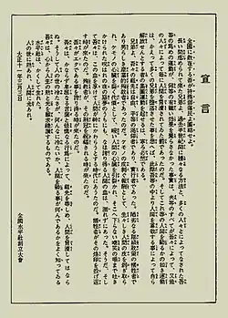 У декларації Товариства (яп. 水平社創立宣言) і прийнятих на першому його з'їзді резолюціях особливо виділялися пошана прав людини та рівність, активно критикувалася дискримінація, товариство відвернулося від храмів хонґандзі, які розпоряджалися майбутнім життям (після смерті), заявляло ідеї незалежного звільнення та економічної свободи. Населення країни дізналося із ЗМІ про створення організації, її характер та цілі. У всій країні почали формуватися регіональні відділення товариства «Суйхейся».