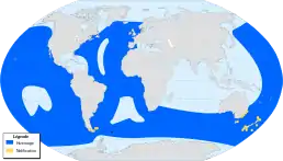 ![]() Поширення сірого буревісника позначено синім кольром, місця парування - жовтим. | ||||||||||||||||||