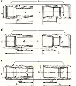 У бурильній колоні основними з'єднуючими елементами є бурильні замки, які випускають декількох типів: 1. ЗН — з діаметром прохідного отвору значно меншим, ніж діаметр прохідного отвору труб з висадженими всередину кінцями (рис. 1 а); 2. ЗШ — з діаметром прохідного отвору приблизно таким, як і діаметр прохідного отвору труб з висадженими всередину кінцями (рис. 1 б); 3. ЗУ — із збільшеним, порівняно із замками ЗШ, діаметром прохідного отвору для труб з висадженими назовні кінцями (рис. 1 в).
