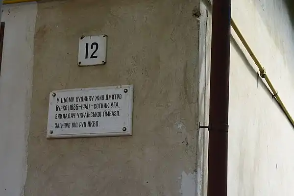 У 1992 році на будинок, в якому мешкав Дмитро Бурко було встановлено мармурову меморіальну дошку.