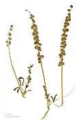 Однорічна або дворічна трав'яниста рослина. Сильно розгалужена пряма трава 30–50 см заввишки. Листя представлені ланцетними листочками, іноді майже лінійними 3–5 мм завдовжки. Маленькі квіти 2–3 мм з жовтими віночками. Плоди — загострені стручки 2–2,5(-3) х 2(-2,5) мм з 1–2 насінням, майже кулясті або яйцеподібні широкі, жовтувато-коричневі, темно-коричневі або зеленуваті. Насіння 1,5–2 мм, яйцевиде, горбкувате. 2n=16