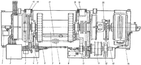 У корпусі 10 розміщується друга ланцюгова передача, яка використовується для приводу вала 11 трансмісії ротора. Вал трансмісії ротора на сферичних роликопідшипниках встановлюється в додатковому розточенні корпусу 10 і виносної опори 12, закріпленої на рамі лебідки. Масляні ванни, закриті кришками і проміжними кожухами 15 і 19, з'єднуються з коробкою передач. Для усунення витоків мастила, що використовується для змащення ланцюгових передач, у стикових роз'ємах масляних ванн встановлюються прокладки. На рамі з боку пульта 2 бурильника змонтовані стійка 8 балансира, гальмівний вал 17 і вал 5 рукоятки управління стрічковим гальмом. Електромагнітне гальмо 14 кріпиться до рами співвісно з підйомним валом і з'єднується з ним кулачковою муфтою 13. На рамі встановлено два тахогенератори 9 і 20. Тахогенератор 9 призначений для контролю частоти обертання столу ротора і з'єднується ланцюговою передачею з валом трансмісії ротора 11. Тахогенератор 20 з'єднується з валом електромагнітного гальма і призначений для контролю швидкості спуску колон труб при автоматичному режимі роботи електрогальма. На стійці 1 встановлений командоаппарат комплексу АСП для блокування переміщень механізму захоплення свічки і талевого блоку. Привід командоапарата здійснюється від ланцюгової шестерні на підйомному валу лебідки. До рами кріпиться повітропровід 6 системи пневматичного управління лебідкою. Для безпечної роботи та захисту від забруднення рухомі частини лебідки закриті металевими кожухами з дверцями для доступу до її вузлів.