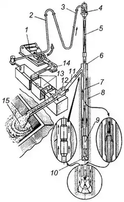 - Спеціальний насос забирає його з відстійнику і направляє через бурильну трубу в свердловину.