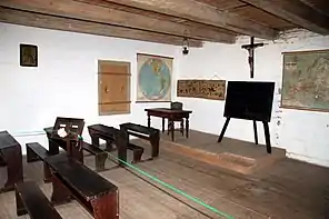 У плані складається з трьох основних приміщень: класу й житла вчителя, які розділені коридором.