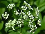 Квітки зібрані в 12—18-променеві зонтики. Пелюстки білі, обернено-серцеподібні, на верхівці глибоковиїмчасті.