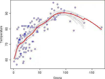 Взаємозв'язок між озоном і температурою в цьому прикладі є очевидно нелінійним, що видно на розсіяному графіку. Щоб описати математично це відношення застосовують LOESS рівні частинки. Замість того, щоб побудувати одну точку з повним набором даних, зразу намалювали 100 зразків за аналогією. Кожен зразок відрізняється від початкового набору даних, але він схожий за розподілом і мінливістю. Прогноз був зроблений на основі 100 груп. Перші 10 прогнозованих зразків є сірими лініями на графіку, які є дуже гнучкими.