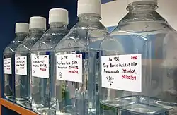 В експериментах із біохімії та молекулярної біології первинно використовувались звичайні буфери на основі слабких кислот та їхніх спряжених основ, такі як цитратні, ацететні, фосфатні. Проте вони мали ряд недоліків, таких як досить значна зміна pH при розведенні або зміні температури, проникнення їхніх компонентів через клітинні мембрани і вплив на фізіологічні процеси. Тому на зміну їм стали застосовувати буфери на основі інших речовин, наприклад основи трис(гідроксиметил)амінометану (скорочено трис) (наприклад трис-ацетатний, трис-боратний), цвіттер-іонної сполуки MOPS тощо[16].
