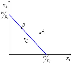 Точка на рисунку не належить до бюджетної множини, тобто, споживач не може купити відповідного набору. Набори та є досяжні для користувача, причому, на набір він видасть увесь свій бюджет. Відрізок прямої (2), що знаходиться між осями (на рисунку синій колір), називається бюджетною лінією. Бюджетна лінія містить усі комбінації товарів, на які споживач мусить видати весь свій бюджет. На приклад, точка перетину з віссю означає, що користувач на весь бюджет купив одиниць першого товару. Пересуваючись лінією бюджету вгору-вліво зменшуємо кількість першого товару та збільшуємо другого.