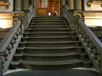 Вестибюль[а], високе приміщення з численними втопленими в стіну подвоєними колонами, немов насилу стримує сходи, що виливаються на підлогу.