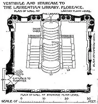 Вестибюль, читальна зала та сходи приміщення бібліотеки були спроєктовані італійським скульптором і художником Мікеланджело Буонарроті.