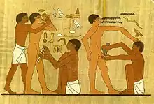 Навіть П'ятикнижжя написане не Мойсеєм, тобто фальсифікат виданий для авторитетності текстів іншими особами буцімто «написане Мойсеєм» (Томас Гоббс, Бенедикт Спіноза)[7][8]. А для гігієни у відповідних кліматичних умовах Єгипту (при дефіциті води) обрізання було записане пізніше юдеями-євреями в Біблії немов як «завіт з Богом», що зображено було єгиптянами 2350—2000 років до н. е., коли євреїв та юдаїзму не існувало й не було писемного івриту (див. ілюстрацію). Не гребували євреї-юдеї плагіатом і коли історію долі Імхотепа радника фараона Джосера (2697—2673 рр. до н. е.) приписали в текстах Біблії стародавньому казковому юдею-єврею Йосипові: Відповідно археологічних даних (щодо запису на скелі острову Сехель на р. Ніл коло Асуану копії тексту фараона Джосера) було приписано єгипетську історію ізраїльському народу тоді, коли ізраїльського народу та юдейської релігії навіть не існувало в описуваних реальних подіях[9].