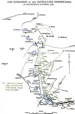 ![]() Мапа «Бігу до моря» з 15 вересня по 8 жовтня 1914 року Мапа «Бігу до моря» з 15 вересня по 8 жовтня 1914 року | |||||||
