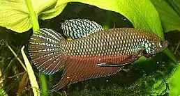 Тіло у дорослих самців має темне червонувато-коричневе забарвлення з блискучими зеленими або синіми цятками на лусках і зябрових кришках, темна облямівка луски утворює на тілі сітчастий малюнок. Червоні промені спинного, анального та хвостового плавців чудово контрастують із яскраво-зеленими або зелено-бакитними барвами їх полотна. На спинному плавці можна помітити косі темні смужки. Черевні плавці темно-червоні з білими кінчиками.