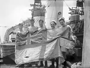 ![]() Екіпаж британського ескадреного міноносця HMS «Тартар» (F43), що брав участь у бою, з військово-морським прапором Великої Британії Екіпаж британського ескадреного міноносця HMS «Тартар» (F43), що брав участь у бою, з військово-морським прапором Великої Британії | |||||||
