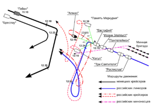 Російські кораблі почали скорочувати інтервали, міноносці підтяглися до ескадри. Ебергард розпорядився збільшити хід до 14 вузлів. Через півгодини «Алмаз» доніс: «Бачу ворога по носі». За наказом командувача він почав відхід до флоту, а незабаром відвернули й інші йшовші далеко на флангах між флотом і «Алмазом» крейсера «Пам'ять Меркурія» і «Очаків». Відхід був своєчасним — у швидкості російські крейсера значно поступалися «Гебену», і він міг би встигнути атакувати один з них.