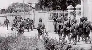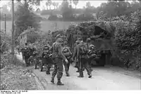 ![]() Британські командос (у беретах) та парашутисти на вулицях Амфревіль, західніше Бревіль-ле-Мон. Червень 1944 Британські командос (у беретах) та парашутисти на вулицях Амфревіль, західніше Бревіль-ле-Мон. Червень 1944 | |||||||
