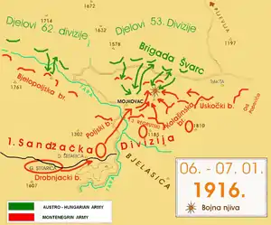 Чорногорська армія, ослаблена в боях 1914 року, у результаті нестачі боєприпасів відчайдушно стримувала натиск австро-угорських військ і відступала углиб території Чорногорії. 5 січня 1916 року Санджацька дивізія чорногорської армії отримала наказ затримати просування австрійських військ біля Мойковаца для того, щоб дати можливість відступити сербській армії.