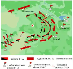 У бою брали участь відділ південної групи УПА-Північ (Військова округа «Богун» під командою Петра Олійника — «Енея») та з'єднання УПА-Південь (під командуванням Василя Кука — «Леміша»).