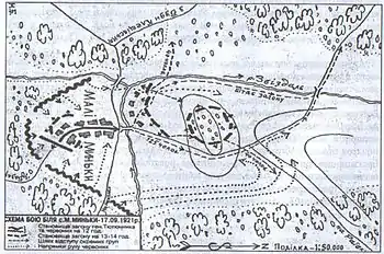 2-га і 3-тя бригади 9-ї кавалерійської дивізії Котовського оточили українські сили. Комбінованим ударом вони відокремили від решти колони авангард, при якому перебували Тютюнник, Отмарштейн, Янченко, два комбриги та десяток саней із пораненими. Другим ударом відступні українські сили знову поділені навпіл. Бійці боролися до останнього набою. Окремі вояки, аби не потрапити до більшовицького полону, підривали себе останньою гранатою. Так вчинили урядовець, міністр Військово-Морських Сил Української держави М. Білинський, ройовий Андрієвський та інші[4].