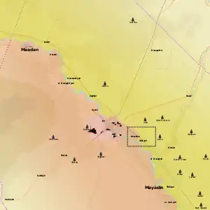 В період відносного затишшя на цій ділянці сирійського фронту[виправити стиль][невдалий термін], ударна група із числа російських найманців «ПВК Вагнера» та їхніх сателітів[невдалий термін] вдалися до мародерського рейду, задля захоплення нафтогазоносних площ на східному березі Євфрату, підконтрольній коаліції з курдсько-американських сил. Останнім довелося діяти наввипередки, щоби зупинити групу з пів тисячі нападників.