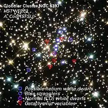 На фотографії кулястого зоряного скупчення NGC 6397 (рис. 5) ідентифікуються білі карлики обох типів: і гелієві білі карлики, що виникли при еволюції менш масивних зір, і вуглецеві білі карлики — результат еволюції зір із більшою масою.