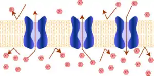 Інші молекули, залучені до сигнальної системи, — рецептори, що можуть бути як мембранними, так і цитоплазматичними або периплазматичними білками. Одна частина молекули рецептора сприймає сигнал, який з допомогою конформаційних змін передається на іншу частину молекули, що активує передачу сигналу на інші клітинні компоненти. У мембранних рецепторів частина молекули, що зв'язується з сигнальною молекулою, знаходиться на поверхні клітини, а домен, що передає сигнал, усередині[41]. Часто рецептори є водночас і мембранними каналами, відповідь яких на зовнішній сигнал полягає в зміні концентрації певного іона в клітині.