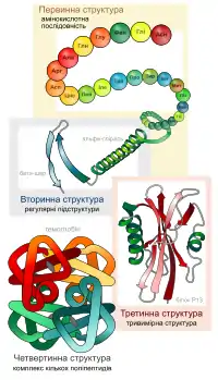 Окрім послідовності амінокислот поліпептиду (первинної структури), для функціонування білків украй важлива тривимірна структура, яка формується в процесі згортання білків (або фолдинга, від англ. folding). Ця структура утримується в результаті взаємодії структур нижчих рівнів. Тривимірна структура білків за нормальних природних умов називається нативним станом білка. Хоча чимало білків здатні згортатися та приймати нативний стан самостійно, завдяки властивостям свого поліпептидного ланцюжка, інші вимагають допомоги інших білків, молекулярних шаперонів. Виділяють чотири рівні структури білків[9]: