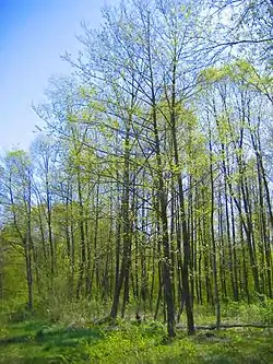 - листяні представляють: дуб черешчатий, береза бородавчата та пухнаста, граб, вільха чорна, ясен звичайний, осика. Значно рідше зустрічаються дуб скельний, в'язи шорсткий і гладкий.