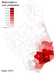 Згідно з даними перепису населення Польщі 2011 року білоруське населення склало 43878 людини, зменшившись у порівнянні з переписом 2001 р. приблизно на 4 тис. (у 2001 р. — 47 640). Найбільшу частку білоруси становили в чотирьох південно-східних повітах Білостоцького воєводства: 39,2 % — в Гайнівському повіті, 19,8 % — у Більскому, 3,46 % — у Семятицькому, 3,2 % — в Білостоцькому. У 12 ґмінах воєводства частка білорусів перевищувала 20 %, а в чотирьох ґмінах (81 % в гміні Чижі Гайнівського повіту, 81 % в гміні Дубичі Церковні Гайнівського повіту, 68 % в гміні Орля Бєльського повіту, 84 % в гміні Гайнівка Гайнівського повіту) частка білоруського населення була більше 50 %. За офіційними підрахунками білоруська меншина є другою найбільшою національною меншиною в Польщі після німецької меншини (144236 осіб)[5].