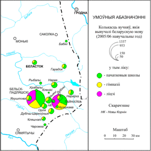 Білоруська мова викладається в 39 початкових навчальних закладах (в 23 школах, 14 гімназіях, 2 ліцеях), її вивчає 8 тисяч дітей і підлітків білоруської національності. Від 1997 в Білостоці існує університет (колишня філія Варшавського університету), де є кафедра білоруської культури.