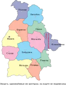 - Молодечненська область (з 20 вересня 1944 по 20 січня 1960, увійшла в Вітебську, Гродненську і Мінську)