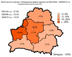 Зміна частки учнів білоруськомовних шкіл з 2001 по 2010 рік
