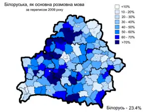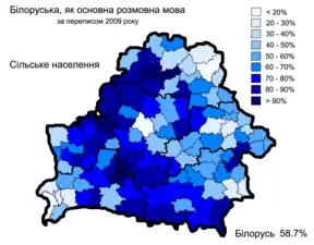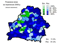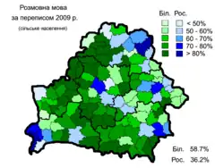 За даними перепису населення 2009 року, більшість населення — 5 058,4 тис. (53,2 %) назвали білоруську мову рідною. Це на понад 20 % менше, ніж під час перепису 1999 року, коли білоруську мову назвали рідною 73,6 %. Серед міського населення білоруську назвали рідною 44,1 % населення, російську — 49,8 %. Серед сільського населення — 79,7 % та 17,7 % відповідно.